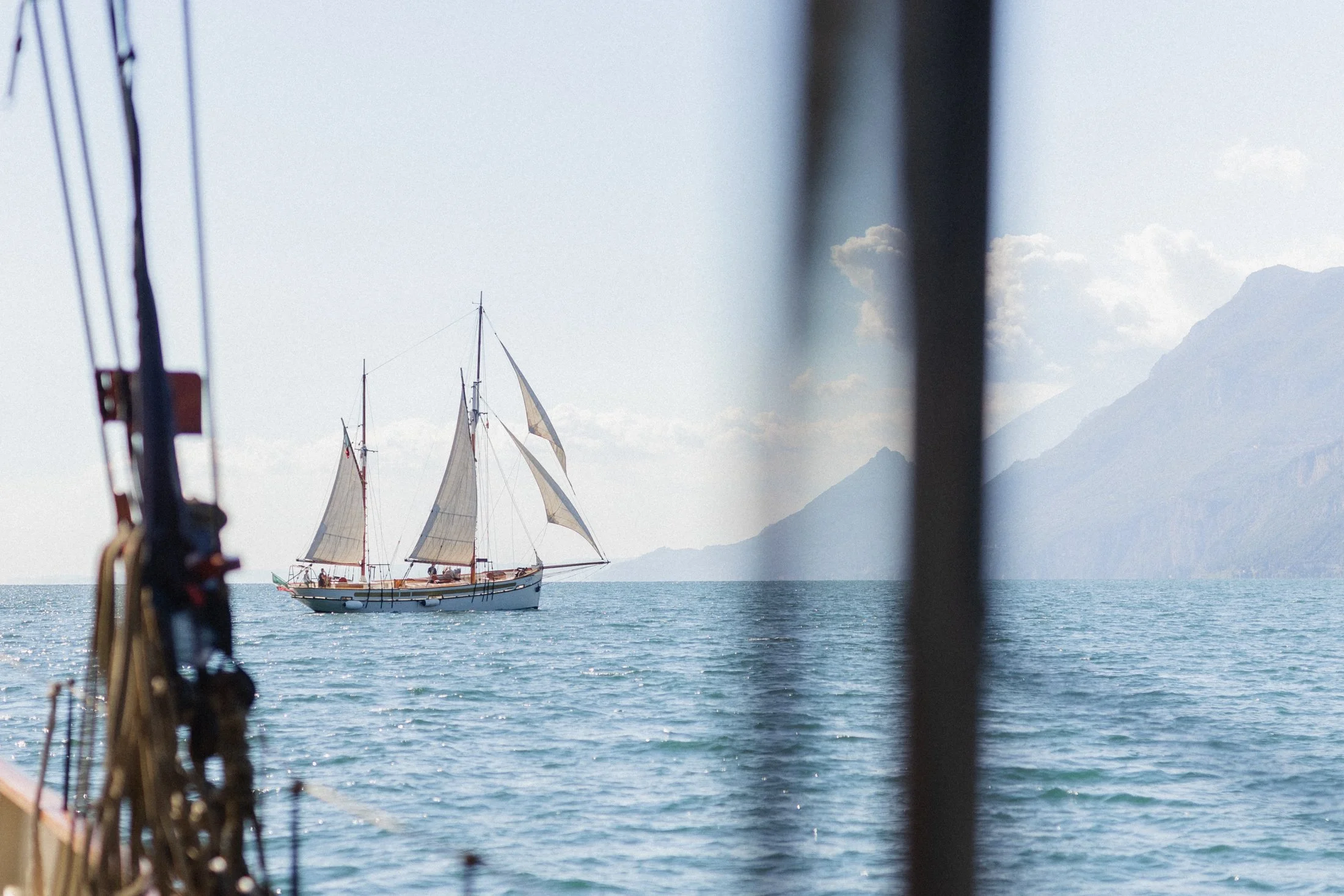 The sailboat Siora Veronica, with the mountains and picturesque towns in the background – a dream for wedding photographers at Lake Garda.